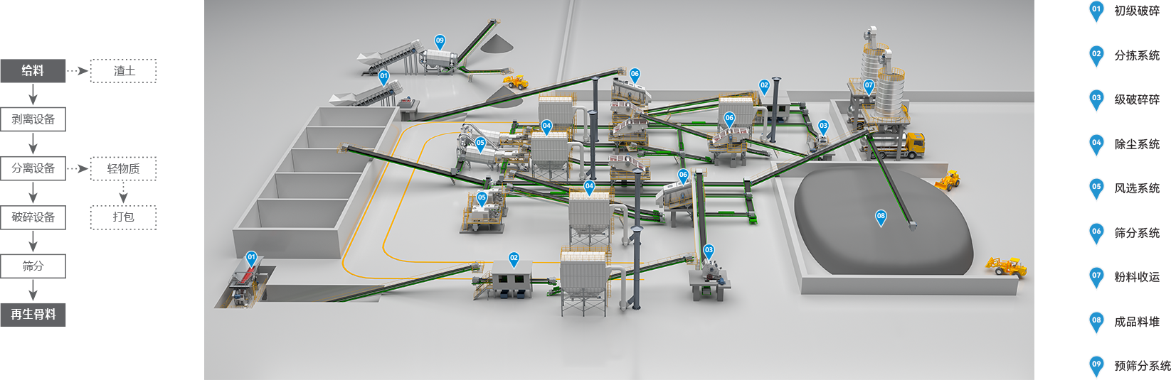 再处理环节:可采用多种模块组合,生产再生骨料、商品混凝土、节能墙体、免烧砖等多种绿色环保建材。